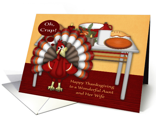 | Artist Notes: | Wish your wonderful aunt and her wife Happy Thanksgiving with a humorous card featuring a cute turkey with a talk bubble thinking Oh, Crap in front of a table loaded with preparations for a holiday feast. Inside like all Greeting Card Universe cards can be personalized by you if you wish to give it your own personal touch. Design by Laurie Schneider, elements by La galerie de Jackie, Digital Designs by Elena |