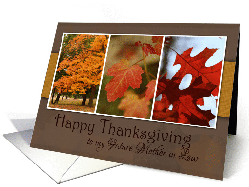 Colorful snap shot style photos of a tree in full golden leaved glory, and two other close up photographs of deep red and orange fall leaves.The photos are grouped together and trimmed in white with a shadow effect behind. A patterned deep gold-yellow colored "ribbon" runs behind the photos. The background is autumn tan color with faded autumn leaves pattern running across the bottom. A deep brown colored text reads "Happy Thanksgiving to my future Mother in Law"