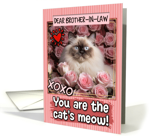 | Artist Notes: | Love and kisses from this super cute Himalayan cat posing amongst a giant bouquet of pink roses on a pink striped background with a gold colored trim and the text "dear brother-in-law you are the cat's meow!" A sweet card to send to your wonderful brother-in-law for Valentine's Day. |
