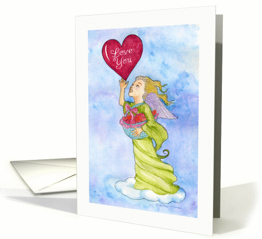 | Artist Notes: | A watercolor ethereal cupid holds a basket of hearts, but the biggest one goes to Mom and Dad. Beautiful, sophisticated colors of moss green, purple and blue along with a striking red heart makes this a unique Valentine's Day card. |