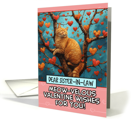 Love and Valentine kisses from this super cute ginger cat sitting in a tree full with hearts on a pink background with a subtle heart motive and the text "dear sister-in-law meow-velous valentine wishes for you!" A sweet card to send to your wonderful sister-in-law for Valentine's Day.