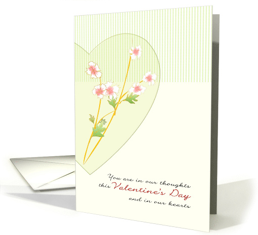 This Valentine's card conveys a message to someone who is going through a first Valentine's Day alone and bereaved, having lost a wife. The design shows pink-white florals inside a glass heart. A striped banner in soft green and white, lines the top of the card. The background is a soft yellow color. All effects are digitally rendered.