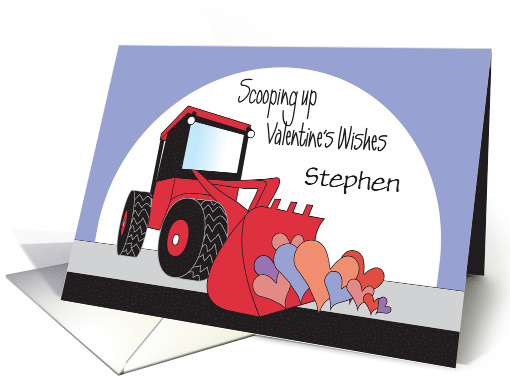 "Scooping up Valentine's Wishes" is the hand lettered wording on this delightfully fun valentine for a special boy you know, whether family, friend or neighbor. Below the wording, there is an area where you type in the boy's name you are sending your card to, as you order his card. The card's red front loader is scooping up all sorts of hearts and Valentine wishes in many sizes and in colors of orange, red, pink, blue and lavender. The inside wording of the card says "Happy Valentine's Day to a very special boy!"