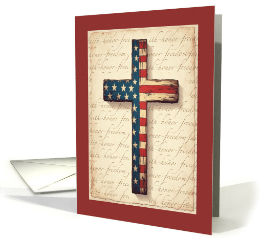 A reverent Veterans Day design featuring a rustic cross painted in the colors of the American flag against parchment, layered with the softly scripted words "faith, honor, freedom." The aged texture and symbolic details express remembrance, gratitude, and faith for those who served and sacrificed. Ideal for Veterans Day observances or memorial messages of honor and reflection.