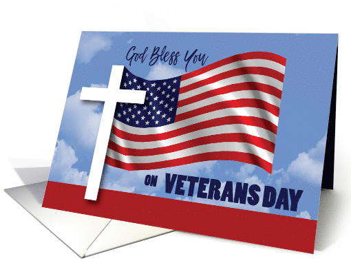 An American Flag waves in the background with a white cross in the foreground. Christian card to show appreciation as you thank someone for their service on Veterans Day. Perfect for man or woman.