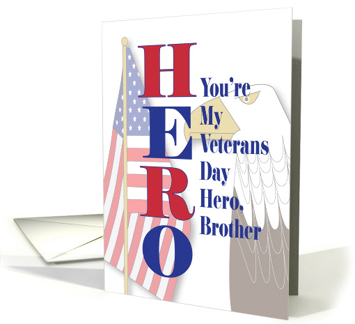 "You're My Veterans Day Hero, Brother" is the blue wording on this Veterans Day card that will make your brother know how much you care for him and appreciate his service to our country. Next to the words, the large red and blue letters that spell "HERO" are stacked vertically, parallel to the flag pole in the background that holds an American flag. Behind the other words, a bald eagle looks into the card, from the right side. The inside wording of the card says "I'm so proud of you and love you very much! Happy Veterans Day to my hero!"