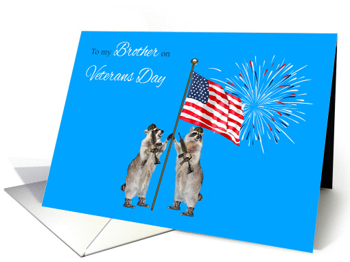 Veterans Day To Brother, armed raccoons with flag and fireworks, blue