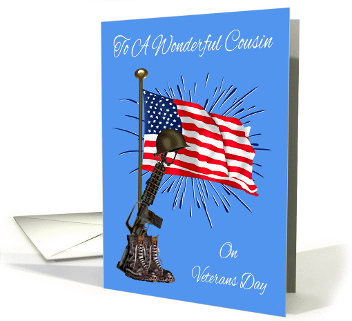 | Title: | Veterans Day To Cousin, combat boots, rifle, helmet against USA flag |