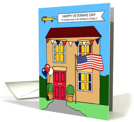 A simple illustration of a house decorated patriotic bunting, a flag and balloons. A plane is flying overhead which has a banner behind it. The banner says 'Happy Veterans Day' and can be cusomized with any name or names.
