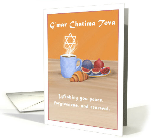 This charming G知ar Chatima Tova Yom Kippur greeting card features a digital hand illustration by Daphsam. The design features a steaming cup of coffee, its swirls forming a Star of David, surrounded by symbolic pomegranates, figs, and a sweet rugelach pastry. This unique artwork blends tradition with warmth, capturing the spirit of reflection, renewal, and community that follows the fast.