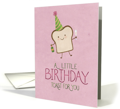 Artist Notes: | An illustration of a cute piece of toast in a celebratory mood holding a bottle of bubbly in one hand and a sparkling glass of champagne in the other. Hand lettered beneath the art are the words "A Little Birthday Toast for You". Artwork by Lisa M Griffin |