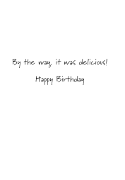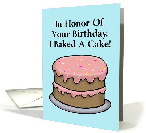 Humorous Birthday card with a drawing of a cake on a platter. The words on a light blue background say, In honor of your birthday, I baked a cake! Inside says, By the way, it was delicious! Happy Birthday