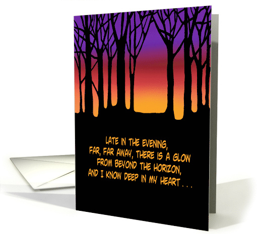 Humorous Birthday card with a drawing of a sunset seen through silhouetted trees. The words say: Late in the evening, far, far away, there is a glow from beyond the horizon, and I know in my heart . . . Inside says: . . . It's your birthday cake! Happy Birthday