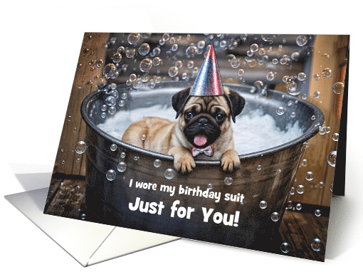 | Artist Notes: | A cute and funny birthday card featuring a darling pug puppy in a bath and wearing his birthday and party suit! Fun and bubbly and makes a splash! |