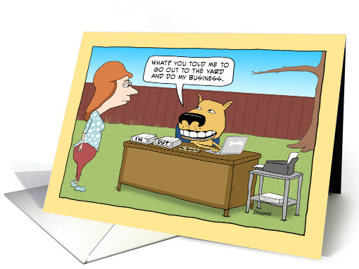Artist Notes: | This funny birthday card features a dog doing its business in the yard, just like it was instructed to do. ©2015 Chuck Ingwersen |