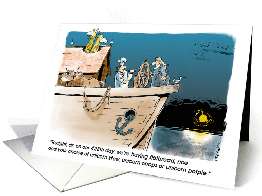 | Artist Notes: | Nighttime falls on Noah's ark in this dark cartoon scene on the water. The moon is visible. Noah's chef is determining the menu, offering Unicorn. The explanation of where the Unicorns went leads into a Happy Birthday wish. Either male or female receivers would enjoy the message of conservation. |