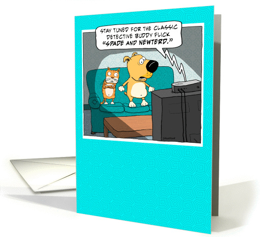 Artist Notes: | Here's a funny birthday card featuring a cat and dog who are terrified by what they hear on the TV. Copyright Chuck Ingwersen 2015. |