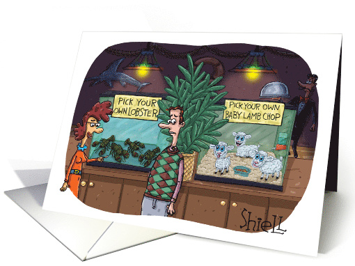 A man and woman are standing at the “Pick Your Own Lobster” tank at a seafood restaurant when the man spots the “Pick Your Own Baby Lamb Chops” cage behind a fern. The baby lambs seem to think that they are at a pet store and are about to be picked to go to a nice loving home.