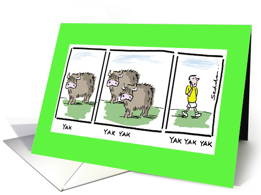 | Artist Notes: | A funny green brown and yellow comic cartoon card showing a three panel cartoon. In the first panel there is A Yak. In the second panel , there are two Yaks and in the third panel there is a man talking into his cell phone with the caption Yak Yak Yak underneath. The message inside is Everyone's talking about it! Have a great birthday. |