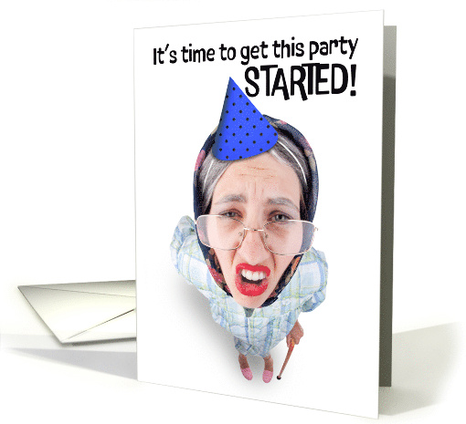 This crabby old lady in a party hat wants to get the party started now since her bedtime is at 9:00! A hilarious way to wish someone a Happy Birthday!