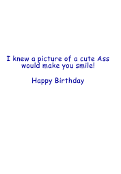 A funny birthday card that is a bit cheeky. An ass sits with a funny expression on his face. Inside the verse reads. "I knew a picture of a cute ass would make you smile!" Give a laugh for your friend's birthday.
