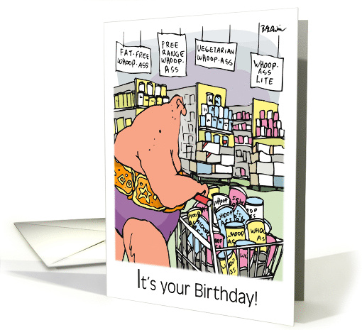 The champion wrestler (or rassler) pushes a cart through the grocery store filling it with cans of whoop-ass. He's going to open a can of whoop-ass, as soon as he get home, you just know it. The front reads, It's your Birthday! Inside reads, Whoop it up! A fun card for all the ass-whooping rasslin' fans out there for their birthday smackdown! Thanks for checking out my greeting cards. More cards: http://www.greetingcarduniverse.com/community/store.asp?store_id=2337&gcu=42744787710&mid=cwu