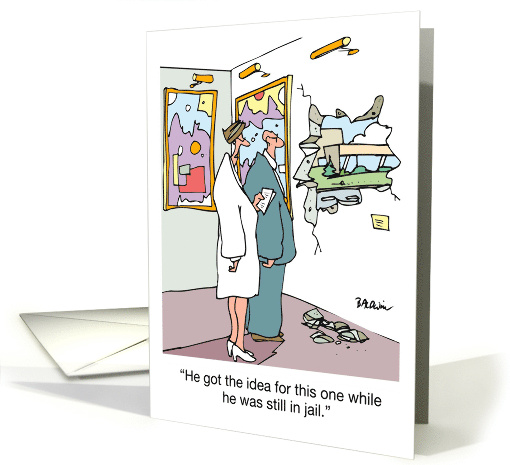 Birthday humor. A man and a woman at an art gallery comment on what appears to be a hole in the wall where a painting once was. The woman, reading from gallery notes says, He got the idea for this one while he was still in jail. Inside reads, Let me paint you a picture. It's your birthday, and there's no escaping it. Thanks for checking out my greeting cards. More cards: http://www.greetingcarduniverse.com/community/store.asp?store_id=2337&gcu=42744787710&mid=cwu