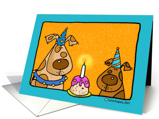 | Artist Notes: | Two cute cartoon doggies wearing birthday hats are looking at a birthday cake with a candle on top. The inside verse hints to someone who's getting on in years. A fun little design to send to someone who is having their happy day. |