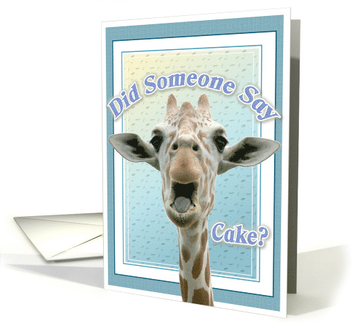 An image of a giraffe head with his mouth open sits at the middle of the card with the text "Did someone say cake?"