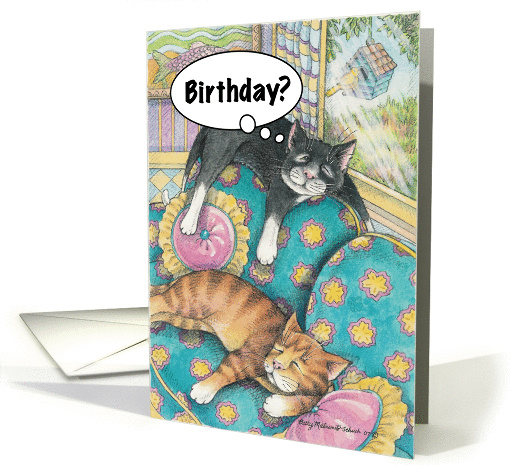 Whimsical cats Bud & Tony napping on sofa with a play on words "there's a NAP for that" punchline inside card. For the smart phone or techie device app user savvy cat lover.