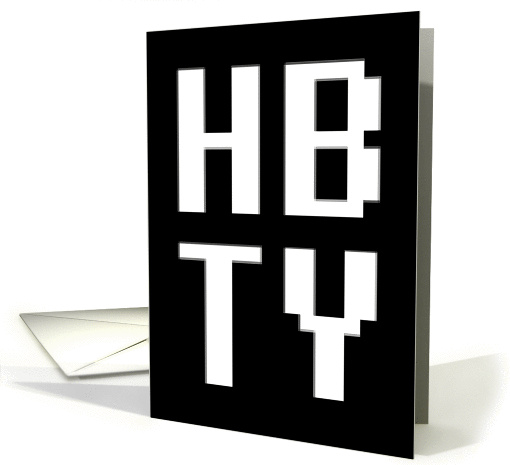 HBTY in white Fixedsys font against a black background. Say Happy Birthday in Nerdish! Emoticons on the inside express arms waving, hugging, and smiling. Perfect for the geek in your life.