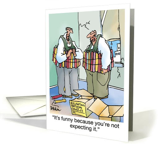 Birthday humor. Two suicide bombers use extra large relighting birthday candles instead of dynamite. One explains to the other, "It's funny because you're not expecting it." Inside reads, Happy Birthday! Hope it's a real blowout.