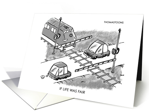 This is a humorous birthday cartoon card where a train is stopping for cars, instead of the other way around. Cartoon is from the Thomastoon's collection.