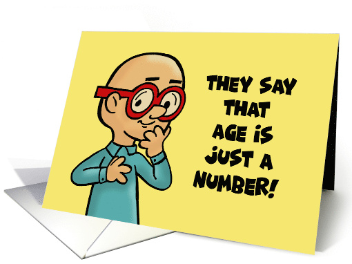 Humorous Birthday Card with a cartoon character on a yellow background. The words say: They say age is just a number. Inside says: Sure, and jail is just a room!. Happy Birthday