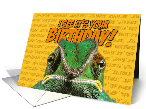 | Artist Notes: | 'I see it's your Birthday!' A close-up shot of a googly-eyed chameleon looking straight at the birthday boy or girl on a yellow background with the repeating words 'Happy Birthday!' A fun way of wishing someone a Happy Birthday. |