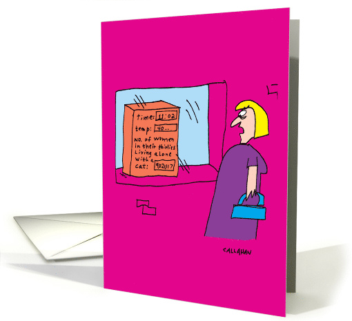 A blonde woman in a purple dress is just looking for the current time and temperature - and comes face-to-face with the sad reality of her ongoing search for Mr. Right: she's one of those millions of females in their 30's forced to live with a feline companion. A little sardonic, a lot funny, with plenty of black good humor and wise truism thrown in for good laughing measure, this bright, bold, clever card has it all; vividly and vivaciously hued in pink, blue, yellow, purple and orange.