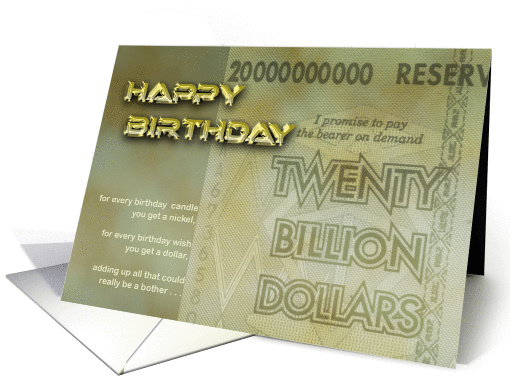 Happy Birthday card depicting obsolete Zimbabwe single currency bill of twenty billion dollars. Front of card reads: For every birthday candle you get a nickel, for every birthday wish you get a dollar, adding up all that could really be a bother...