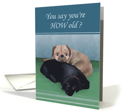| Artist Notes: | You're HOW old?? A funny look on the pug's face says it all. The Cocker Spaniel just sits back as a bystander. Maggie, the pug, and Milo, the spaniel are friends that stick together! Cute card to give to any friend, relative of family member. |