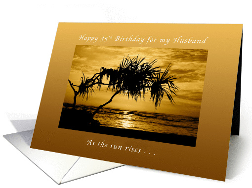 This golden sunrise on a tropical beach makes a beautiful setting for a Happy 35th Birthday wish for your husband.