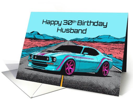 Make your husband’s 30th birthday one to remember with this bold, high-speed pop-art car card, designed to celebrate the beginning of a thrilling new decade! This stunning illustration features a powerful muscle car, painted in a brilliant turquoise hue with sleek hot pink racing stripes and custom alloy wheels, embodying strength, ambition, and the excitement of the road ahead. Positioned on an endless highway, the car symbolizes the journey traveled together and the many adventures still to come. The bold pop-art-inspired desert backdrop, featuring deep blue mountain peaks and a fiery red terrain, creates an eye-catching contrast, adding a sense of motion and energy to the scene. The modern futuristic typography highlights this milestone in bold and celebratory fashion, making it clear that 30 is the perfect time to chase dreams, embrace new challenges, and hit the road toward a future filled with excitement and success.