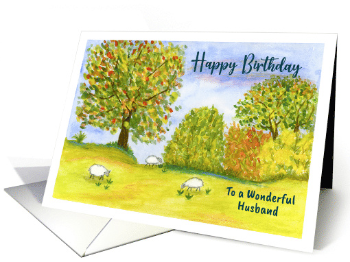 Send your beloved Husband this sincere Happy Birthday card on his special day to show him how much you care for and about him. It features a watercolor painting of a meadow with sheep grazing in it that is decorated for the fall season.