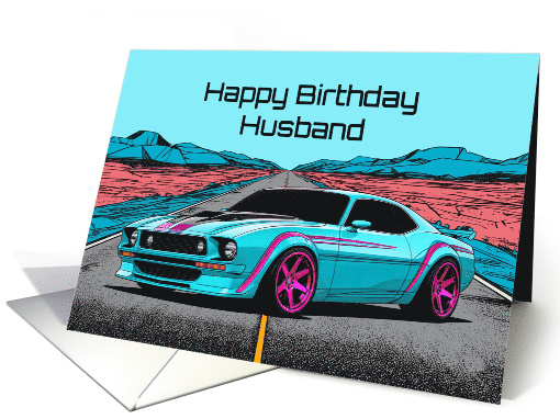 Make your husband’s birthday unforgettable with this bold, high-energy pop-art car card, designed to celebrate his strength, ambition, and adventurous spirit! A sleek turquoise muscle car with hot pink racing stripes and alloy wheels takes center stage, positioned on an infinite highway, symbolizing his accomplishments and the exciting road ahead. The electrifying pop-art desert setting, featuring deep blue mountains and fiery red sands, creates a dynamic contrast, bringing the scene to life. The modern futuristic typography ensures this milestone stands out, making this the perfect birthday card for a husband who loves cars, adventure, and bold artistic design!