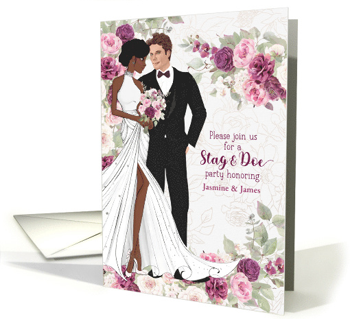 | Artist Notes: | A beautiful mixed race bride and groom, she is gorgeous with dark brown hair and brown skin, he's Caucasian with light brown hair. A lovely Stag & Doe party invitation with custom names. |