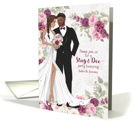 | Artist Notes: | A lovely Stag & Doe party for the bride and groom-to-be, featuring an interracial couple with a light skinned bride and brown skinned groom paired with purple blooms. |