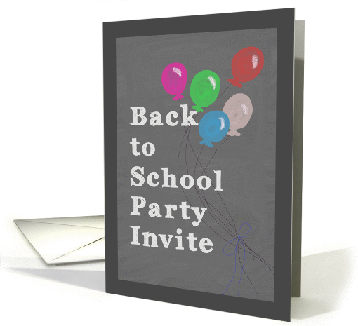 Artist Notes: | Back to School party invitation. This is a chalkboard design with colorful balloons that look like they have been painted with chalk. The card has a darker grey border for effect.. |
