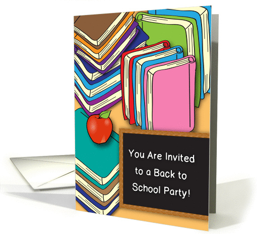 Artist Notes: | This is an invitation to a back to school party, featuring a stack of colorful books, a chalkboard, and a red apple, courtesy of Open Clip Art library. You may change the inside message at checkout, if you wish. 072312 |