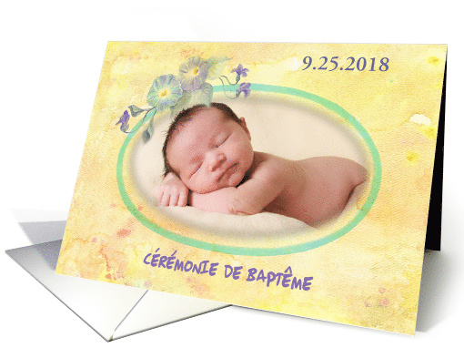 | Artist Notes: | soft & elegant custom christening invitation for baby girl in french, ceremonie de bapteme, personalize it with your baby's photo inside floral frame, original delicate watercolor by judith cheng |