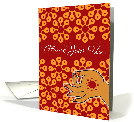 | Artist Notes: | Please Join Us. Bharatanatyam Arangetram dance graduation invitation. Hand in a mudra position and painted with a red design. Fully customizable on the inside with text, message areas and a photograph area for a personal photo. |