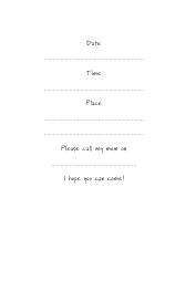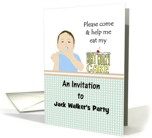 A little boy in a blue T-shirt is eating cake with a spoon. The birthday cake, spelt out in letters, forms part of the invitation message 'Please come and help me eat my birthday cake'. The 'cake' has a layer of white icing on top and is decorated with a cherry.