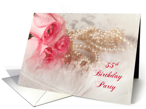35th birthday party invitation featuring pink roses, pearls, and feathers. Invite friends and family to your party with a card that is truly feminine.